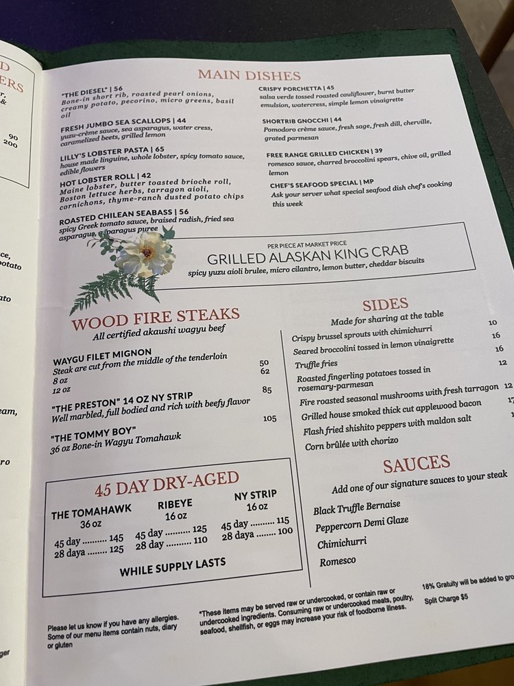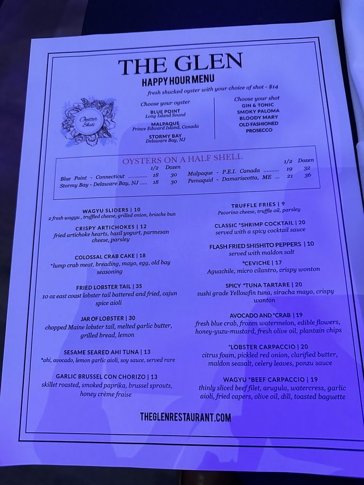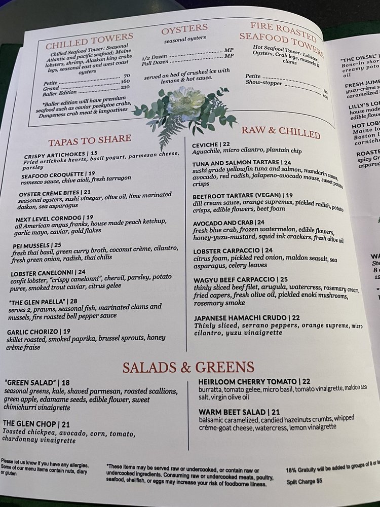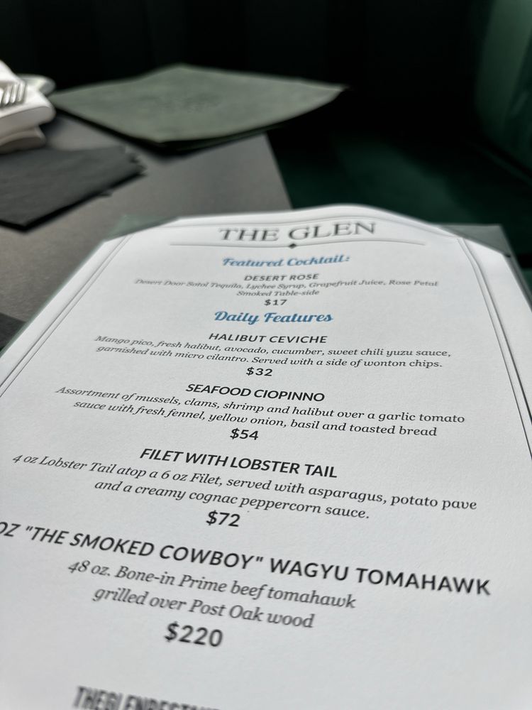 The Glen in Frisco, TX is a unique dining experience that combines steakhouses, bars, and seafood offerings. With outdoor seating, an upscale atmosphere, and a full bar, it's perfect for groups and special occasions. The décor is modern and cozy, with stand-out features like an old-fashioned phone booth and stunning wall murals. Customers rave about the personalized birthday menus and creative drink options. The acrobatic performances and aerialist add excitement to the ambiance. The menu features flavorful dishes like Colossal Crab Cakes, Crispy Artichokes, Bacon Wrapped Dates, and French toast. The Glen is a great spot for a memorable night out with friends or a special date, offering a full-sensory experience with impressive visuals and excellent food and drink options. Make a reservation and indulge in a culinary journey at The Glen.